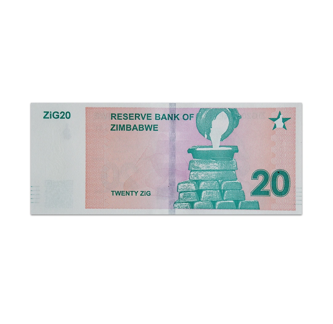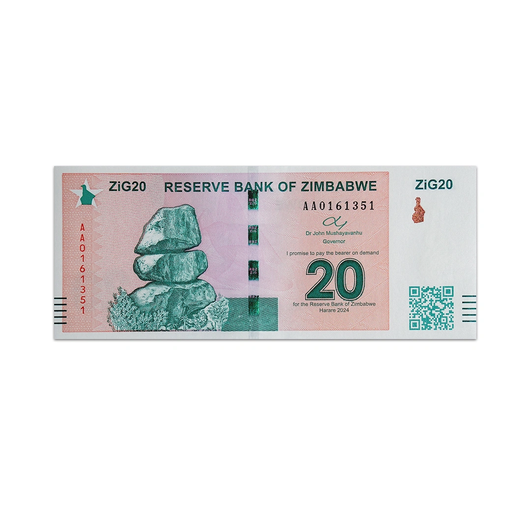This uncirculated 20 Zig Zimbabwe note is a standard circulation banknote issued by the Reserve Bank of Zimbabwe. It is a peach, green, and purple note that is dated 2024, bears the signature of Dr. John Mushayavanhu, and measures 155 x 65 mm. Its obverse side features zimbabwe bird on star as registration device, Chiremba balancing rocks in Epworth, zimbabwe bird in OVI and a QR code. Its reverse side shows molten gold pouring from crucible into ingot mold atop a stack of gold bars and a zimbabwe bird on star as registration device. Security features include a green-to-blue windowed security thread with demetalized RBZZIG and a watermark of zimbabwe bird.
