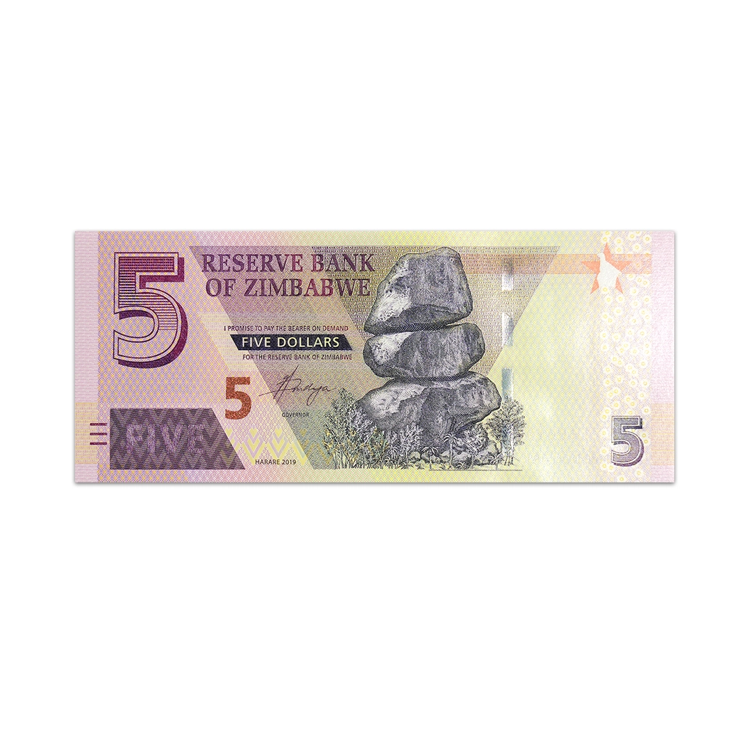 The Zimbabwe 5 Dollar banknote is part of the 2019 issues of the Reserve Bank of Zimbabwe. Featured on its obverse is the Chiremba balancing rock formation in Epworth. On the back of the note are three giraffes and trees. This paper bill is 155 x 66 mm in size and bears a windowed security thread with a demetalized RBZ. It also has a watermark that reflects a Zimbabwe bird and a vertical RBZ electrotype. Additionally, the banknote carries a registration device in the form of a Zimbabwe bird on a star. This Zimbabwe 5 Dollar banknote is in uncirculated condition.